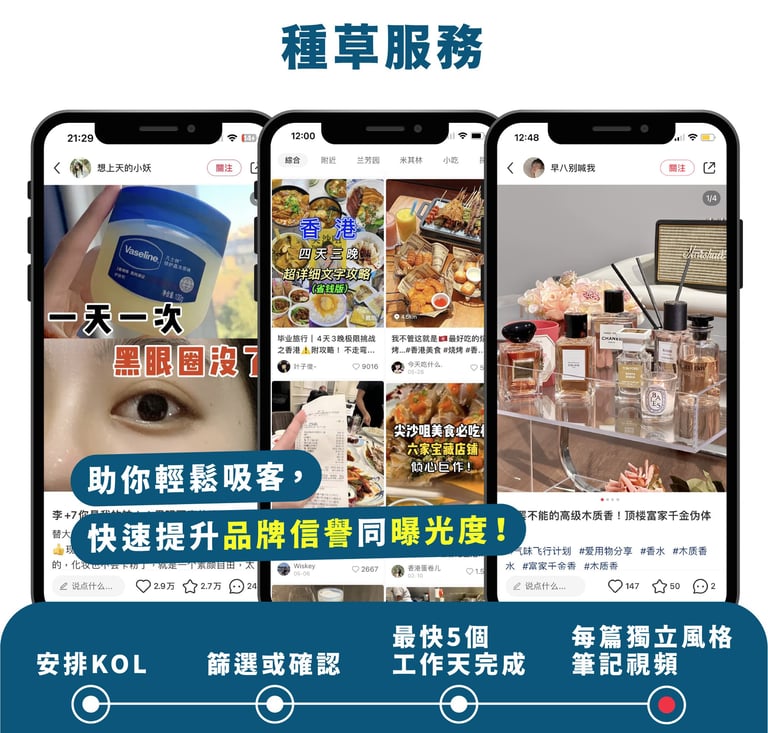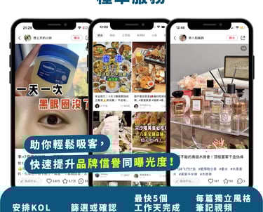 “種草”是通過分享和推薦某一商品的品質,來激發他人購買慾望的一種行銷手法。透過素人、網紅和達人的種草活動,我們能夠以最低的成本達到最高的曝光量。他們將在網絡上分享您的產品或服務,以大量的數量提高網絡覆蓋率。這種網絡種草的方式能夠有效提升您的品牌形象和曝光率,吸引更多潛在客戶的關注和興趣。